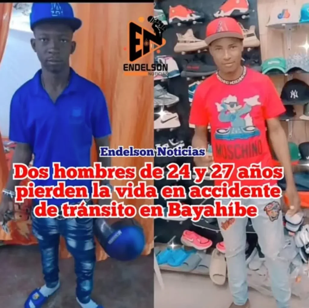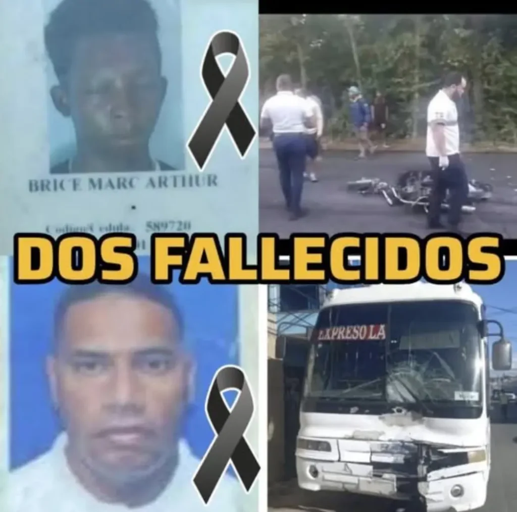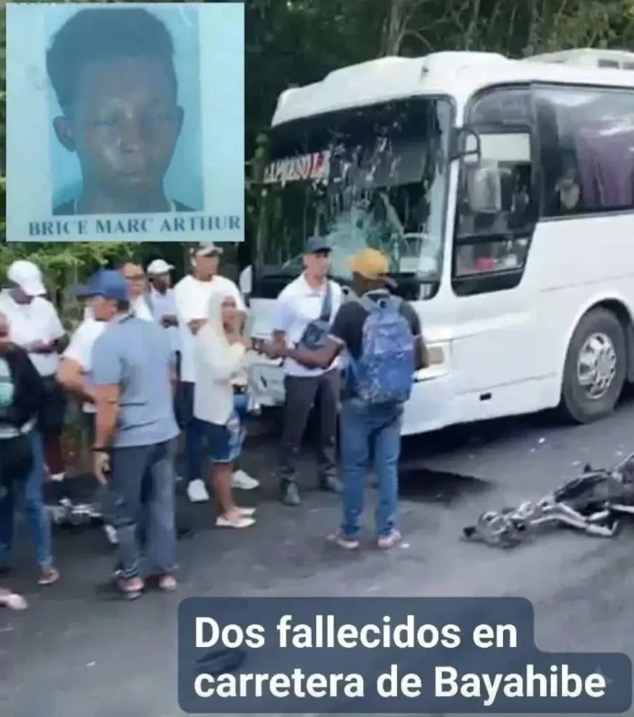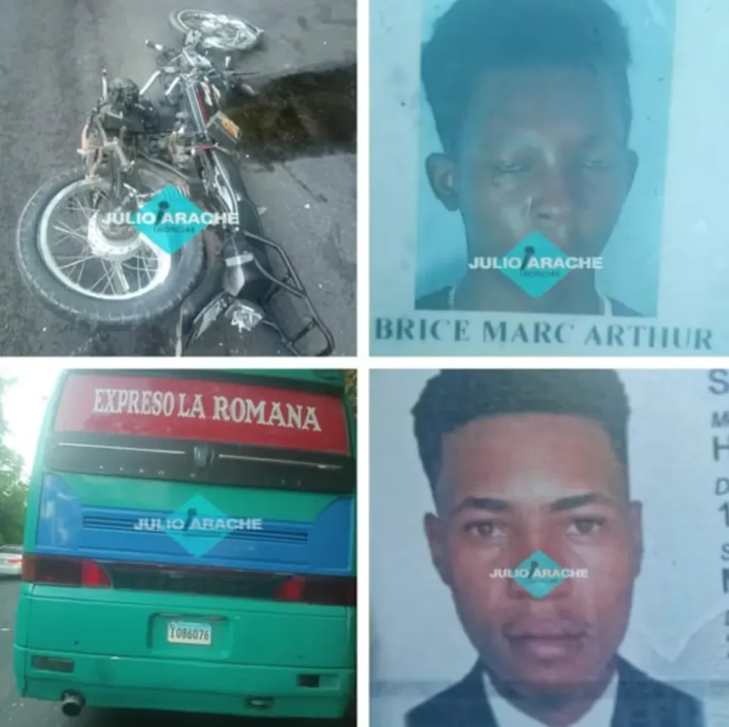 Un suceso vial registrado en la carretera Bayahíbe, provincia La Altagracia, dejó la pérdida de existencia de Samuel Estime (27) y Brice Marc Arthur (24), ambos de nacionalidad haitiana. Según los reportes iniciales, las víctimas se desplazaban en motocicleta cuando se produjo un contacto vehicular frontal con un autobús Hyundai, desencadenando el desenlace descrito por las autoridades locales.